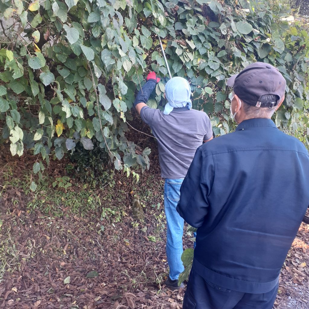 なないろでは手工芸で猫キッカー(猫が蹴って遊ぶおもちゃ)を作成しています。その猫キッカーの中には「またたび」を入れており、買うとなるとなかなかの金額になります。何気なく「どこかにまたたびないかな~。」と話すと、「おらほの田のわぎさいっぺーあるよ。(私の田んぼの脇に沢山あるよ)」と言うではありませんか。早速その方に案内していただき天然またたびを採取することができました。